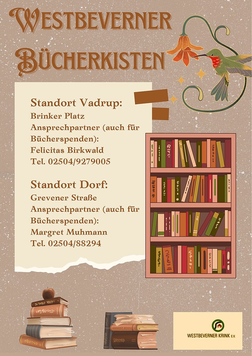 Dem Wunsch der Bevölkerung aus der Dorfwerkstatt nachkommend baute Bernhard Tippkötter die erste Bücherkiste für den Standort "Brinker Platz" in Westbevern-Vadrup. Später entdeckte er eine nicht mehr benötigte Telefonzelle und baute diese entsprechend aus für den Standort Westbevern-Dorf am "Eingang zum Dorfplatz".