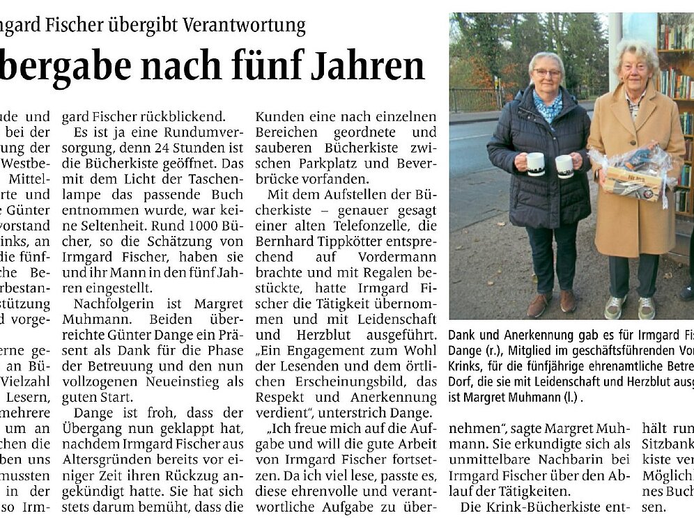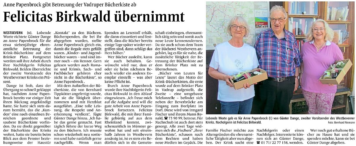 Die Betreuung der Bücherkisten übernahmen in den ersten Jahren Anne Papenbrock für den Standort Vadrup und Irmgard Fischer für den Standort Dorf bis sie durch Felicitas Birkwald für Vadrup und Margret Muhmann für das Dorf abgelöst wurden.